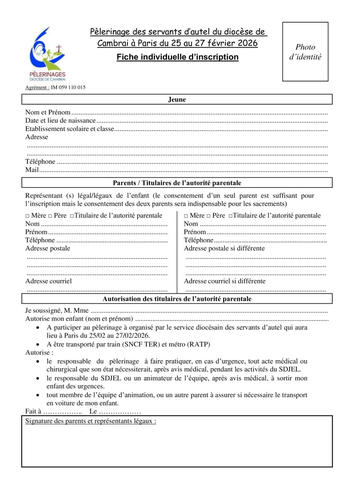 Les documents sont à renvoyer le plus rapidement possible ave un chèque d'accompte de 50€ (à l'ordre des pèlerinage diocésains de Cambrai) à: