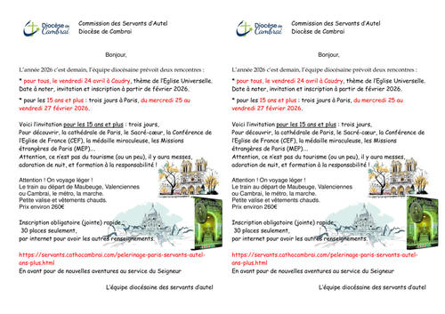 L'équipe diocésaine des servants d'autel invite les servants d'autel (15 ans et plus) du diocèses à participer à un pèlerinage à Paris.
